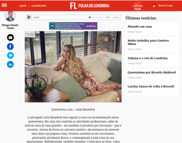 A advogada Carla Benedetti tem seguido à risca as recomendações desta quarentena. Em casa, tem mantido as atividades profissionais, além de exercer uma de suas paixões – ela também é jornalista por formação – que é escrever. Autora de livros no universo jurídico, ela terminou de escrever uma obra e já prepara outra. Positiva, mantém-se em movimento, praticando atividades físicas, e contemplando a bela vista de seu apartamento. Multifacetada, também desenha. O look para as fotos, como revela é “desenho próprio com tecido Dolce Gabbana”. Confira a entrevista.