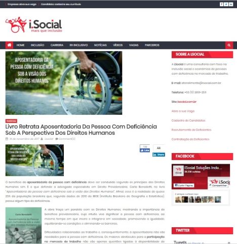 Notícia sobre o livro da advogada Carla Benedetti: Aposentadoria da pessoa com deficiência sob a visão dos Direitos Humanos. Confira notícia clicando aqui.